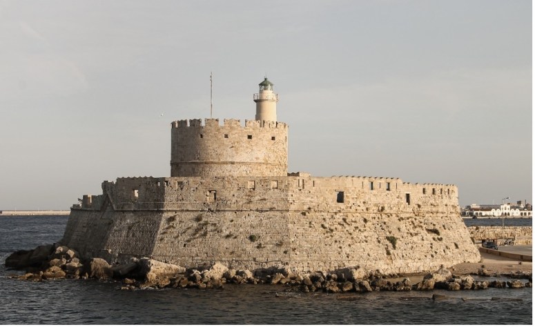 “Possiamo entrare dal Mandraki, il porto naturale più piccolo sulla destra del forte di San Nicola. Troverai un’insenatura lunga e stretta a forma di U”.